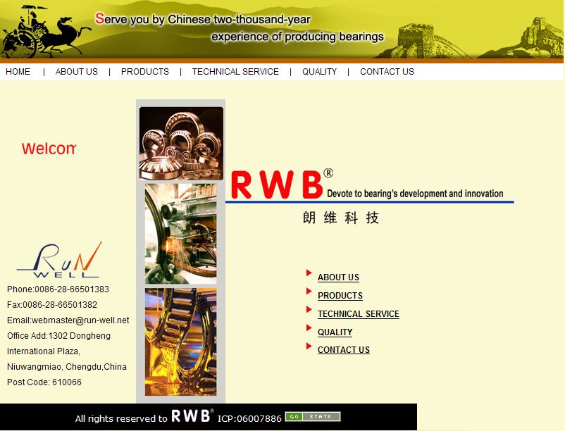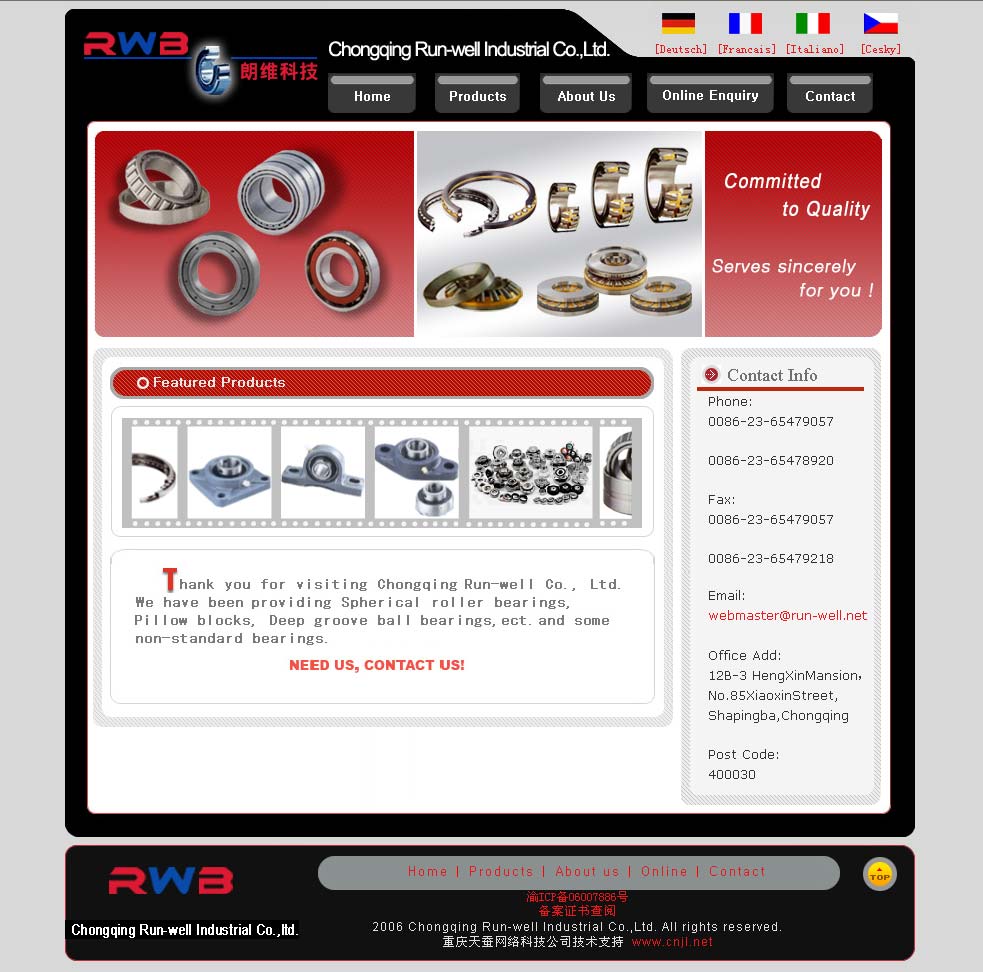朗維科技2007-2008版 Chongqing Run-well Industrial Co.,Ltd. is dedicating to manufacturing & exporting kinds of bearings. RWB Brand spreads to Europe, South America, South-east Asia, Canada, South Africa, Egypt, UAE, etc. We mainly produce Spherical roller bearings, Deep groove ball bearings, Pillow blocks, Metric & inch Tapered roller bearings, Four-row cylindrical roller bearings, Automobile bearings and some non-standard bearings. With 2 experienced engineers from ZWZ, we guarantee we are controlling from raw material, producing, testing to packing. Thus, what we can supply you are experience, sincerity and quality goods. Choose RWB, you will get what you paid, more than it. Need us, contact us! http://www.run-well.net |
